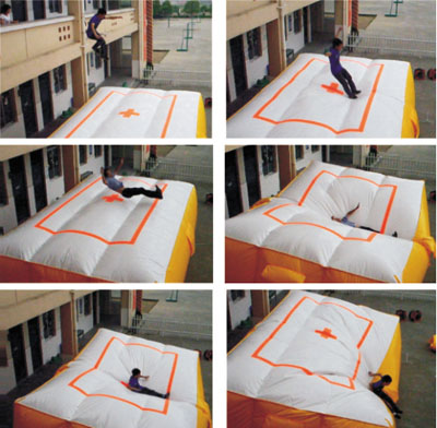 1.跳落过程中,要求单人按顺序挑落,待前一人离开气垫20秒钟后,后一人才可跳,否则有可能导致后者踩伤前者。 2.跳落时要求人双手高举,双脚向前,身体伸直,重心稍向后,腿部略躬,腿部稍后翘。 3.落点选择红色中心安全区,如落在安全区外可能致伤。 4.脚和臀部应同时着垫,然后迅速滑出气垫外。